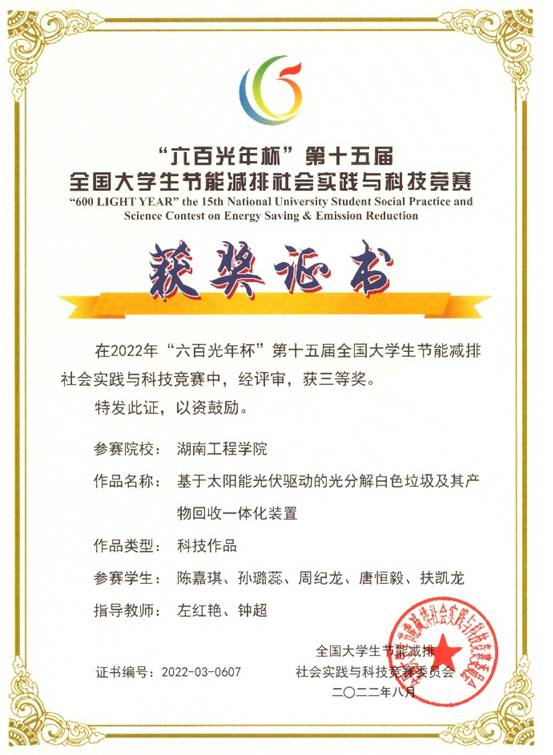 本届大赛共608所高校员工参加,提交有效作品近6000件。2022年8月5日,“六百光年杯”第十五届全国老员工节能减排社会实践与科技竞赛落下了帷幕。经过激烈的角逐,tyc122ccVIP参赛作品《基于太阳能光伏驱动的光分解白色垃圾及其产物回收一体化装置》(参赛员工:工业工程1901班陈嘉琪、孙璐蕊、周纪龙、工业工程1902班唐恒毅、扶凯龙;指导老师:左红艳、钟超)在本次竞赛中荣获大赛三等奖。