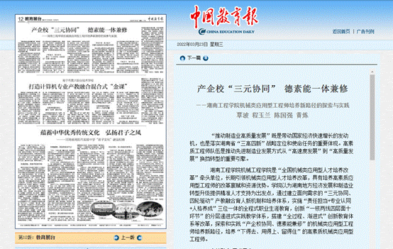 tyc122ccVIP是“全国机械类应用型人才培养改革”牵头单位,长期引领机械类应用型人才培养改革,具有培养高素质应用型工程师的改革禀赋和资源优势。公司以为湖南地方经济发展和制造业转型升级提供精准人才支持为出发点,通过建立面向需求的“三元协同、四轮驱动”产教融合育人新机制和培养体系,实施“责任担当+专业认同+人格养成”三位一体的全程式职业生涯教育,创新“一核两线四层面十环节”的分层递进式实践教学体系,搭建“全过程、渐进式”创新教育体系等改革,探索和实践“产企校协同、德素能兼修”的机械类应用型工程师培养新路径,培养“下得去、用得上、留得住”的高素质机械类应用型工程师。