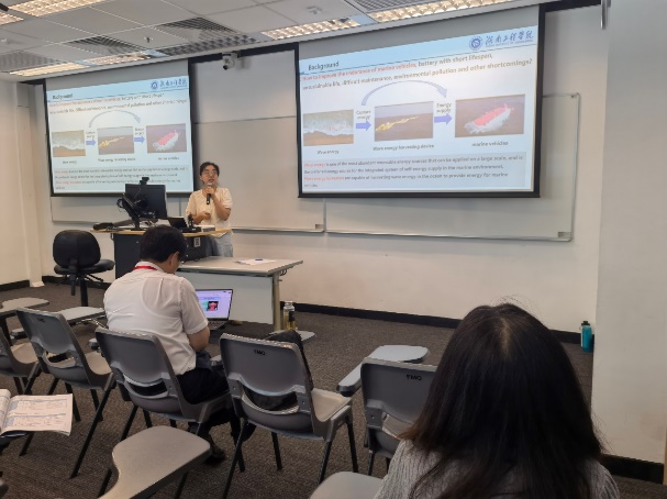 邹鸿翔教授和刘胜副教授担任“Energy harvesting and self-powered wearable systems”专题主席。会上,刘胜副教授作题为“Hierarchical rGO-based triboelectric sensors enable motion monitoring and trajectory tracking”的邀请报告,介绍了一种新型柔性摩擦电传感器(HG-FTS),其输出电压达129V,功率密度约0.5 W/m²,可精准监测人体生理信号并实现智能交互,在医疗监测、人机交互等领域具有重要应用价值。朱月月博士作“Morphing compliant wave energy harvesting vehicle”口头报告,提出一种无系泊波浪能捕获系统,通过柔性机构转换波浪能驱动发电,显著提升低频波浪条件下的能量转换效率,为海洋物联网设备供电提供了创新解决方案。