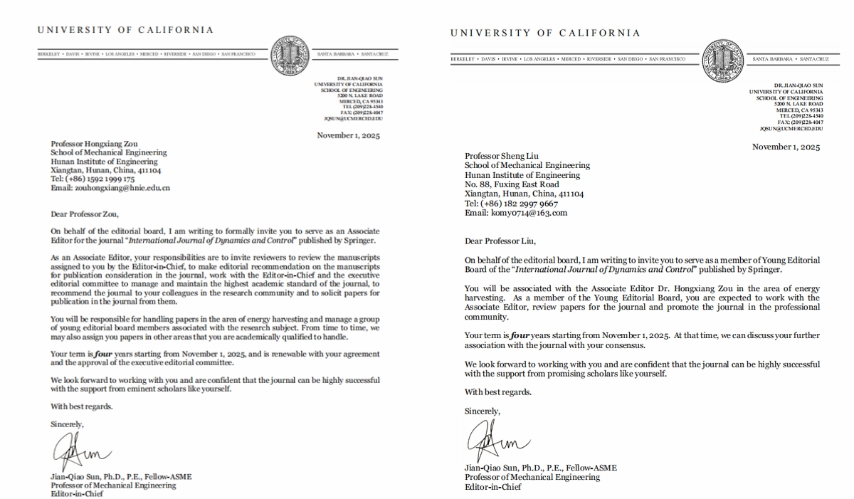 《International Journal of Dynamics and Control》是动力学、振动与控制领域具有重要影响力的国际期刊,致力于发表该领域前沿研究和工程应用的重要成果。两位教师受邀担任期刊学术职务,不仅是对其个人学术水平和声誉的肯定,更将为公司动力学与控制研究领域搭建更广阔的国际学术对话平台,助力公司精准对接国际前沿方向,深化与海外高水平团队的合作,推动学科成果走向国际舞台。